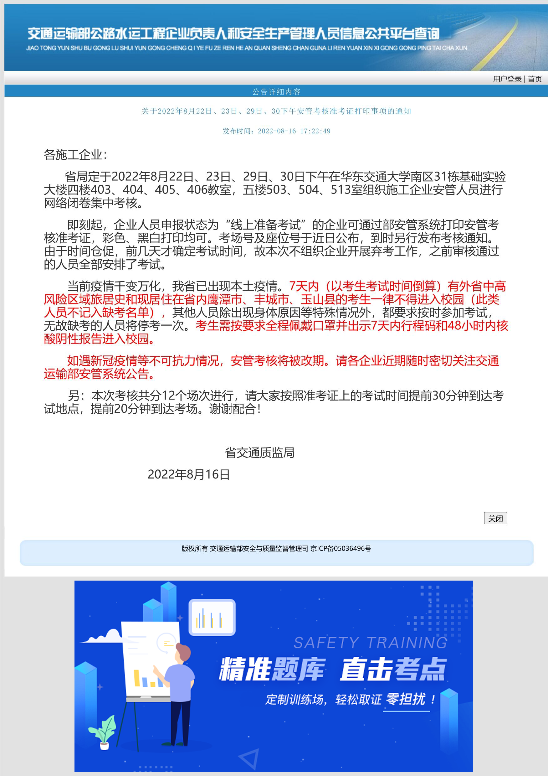 省局擬定于2022年8月22日、23日、29日、30日下午在華東交通大學南區31棟基礎實驗大樓四樓403、404、405、406教室,五樓503、504、513教室組織我省施工企業安管人員進行網絡閉卷集中考核。如遇新冠疫情等不可抗力情況,安管考核將被改期。請各企業近期隨時密切關注部安管系統公告。現將考核相關事項通知如下: 1.因學校是防疫重地,造成公共衛生安全事件的隱患極大,請各位考生一定自覺遵守華東交通大學疫情防控措施。7天內(以考生考試時間倒算)有外省中高風險區域旅居史和現居住在省內鷹潭市、豐城市、玉山縣的考生一律不得進入校園(此類人員不記入缺考名單)。考生需按校園疫情管控要求全程規范佩戴口罩,嚴格執行“一測一掃三查驗”(即測體溫,掃單位碼,查驗健康碼、行程碼和核酸檢測陰性證明【南昌市內考生提供考前24小時內核酸檢測陰性證明;南昌市外考生需落實三天兩檢,提供考前72小時內2次核酸檢測陰性證明】)。 若考生存在7天內(以考生考試時間倒算)有外省中高風險區域旅居史和現居住在省內鷹潭市、豐城市、玉山縣及出現身體原因等特殊情況不能來參加考試的,請企業工作人員將蓋企業公章的情況說明發至1512237261QQ郵箱。 2.為保證考試順利進行,請各企業下載本考核通知的附件《考生須知》和《考生承諾書》。企業應向考生宣貫《考生須知》;并由考生本人填寫《考生承諾書》,進入考場后交給監考老師統一收取存檔,事后不接受補交。未提交《考生承諾書》的,取消當次考試成績,按缺考人員處理。 3.考生必須攜帶本人準考證和有效身份證件(居民身份證或臨時身份證、軍官證、 港澳臺通行證、護照、戶籍證明)方可參加考試。 4.考生準考證上的姓名、身份證號存在錯誤信息的,考前考生必須按照準考證上的姓名和身份證號輸入,將錯就錯,否則調取不到試卷。待考試通過核發證書后,由企業工作人員通過部安管系統更正正確的個人信息。 5.本次安管考核共分12個場次進行。請考生按準考證開考時間提前20分鐘有序進入指定考場,開考20分鐘后,遲到考生禁止進入考場。 6.考生座位表考前會張貼在考場走廊及考場門口。 7.考生須知,考生承諾書,考試時間、地點及乘車路線,安管考核名單及考場安排詳見附件。由于安管系統準考證信息設置功能受限,請企業工作人員將考生的考場號填寫在準考證上,以便考生順利進入考場。 8.嚴明考試紀律,從嚴查處 (1)考生嚴禁隨身攜帶手機等電子產品,自行準備好背包或文件袋。考前進行身份核驗的同時,接受掃描儀的檢查;背包或文件袋放在監考老師指定的監控視頻區域,監考老師不負責看管物品。 (2)考試結束后,由監考老師登記考試成績,考生簽到簽退后,整個考試流程結束方可離開考場,否則考試成績無效。 (3)考生提交試卷時,電腦出現黑屏或亂碼的情況,應由工作人員、考生雙方當場登錄交通運輸部安管系統查詢考試成績后,由考生補登考分。 (4)考試成績現場經過考生確認,監考考師登記后,事后考試組織部門不接受申訴。 (5)考生故意擾亂考點、考場等考試工作場所秩序或威脅、辱罵監考老師的,責令離開考場;影響考試正常進行,違反《中華人民共和國治安管理處罰法》的,交由公安機關依法處理。 (6)發生替考、代考等考試舞弊行為的人員,依據《江西省公路水運工程施工企業主要負責人和安全生產管理人員考核管理實施細則》第十七條款規定,給予取消當次考試成績,并記入安管人員考核誠信檔案,3年內不受理其考核申請的處理。 (7)存在以下兩種情形之一的,說明考生存在場外考試的情況,給予取消當次考試成績的處理。 ①監考記錄上考生未簽到簽退、未登記考試成績,但交通運輸部安管系統又顯示其考試已通過; ②監考記錄上登記的考試成績不合格,但交通運輸部安管系統又顯示其考試已通過。 此考核通知同時通過交通運輸部安管系統和本工作群發布,請企業相互通知。謝謝! 附件一 《考試地點、時間及乘車路線》 附件二 《考生須知》 附件三 《考生承諾書》 2022年8月22日、23日、29日、30日下午各場次考試人員名單及考場安排隨本考核通知一并公布。 省交通質監局 2022年8月18日 |