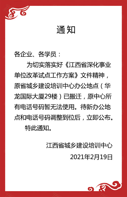 為切實落實好《江西省深化事業單位改革試點工作方案》文件精神,原省城鄉建設培訓中心辦公地點(華龍國際大廈29樓)已搬遷,原中心所有電話號碼暫無法使用。待新辦公地點和電話號碼調整到位后,立即公布。
