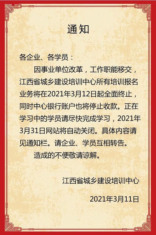 因事業單位改革,工作職能移交,江西省城鄉建設培訓中心所有培訓報名業務將在2021年3月12日起全面終止,同時中心銀行賬戶也將停止收款。正在學習中的學員請盡快完成學習,2021年3月31日網站將自動關閉。具體內容請見通知欄。請企業、學員互相轉告。