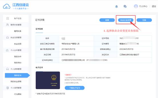 當執證人員因單位調動,需要辦理證書變更業務時,在“證書詳情”頁面,點擊“執業企業變更”,系統自動檢測本人實名制認證、上傳證件照、聘用關系登記、無在辦理業務等條件,各項條件滿足,申請單由證書所在單位確認后才會提交至相關業務部門審查,審查完成后簽發電子證書,實現“一次不用跑”。操作流程:【我的證書】→【異常狀態】→【業務辦理】→【執業企業變更】→【證書所在單位確認】→【業務提交至主管部門審核】,如下圖: